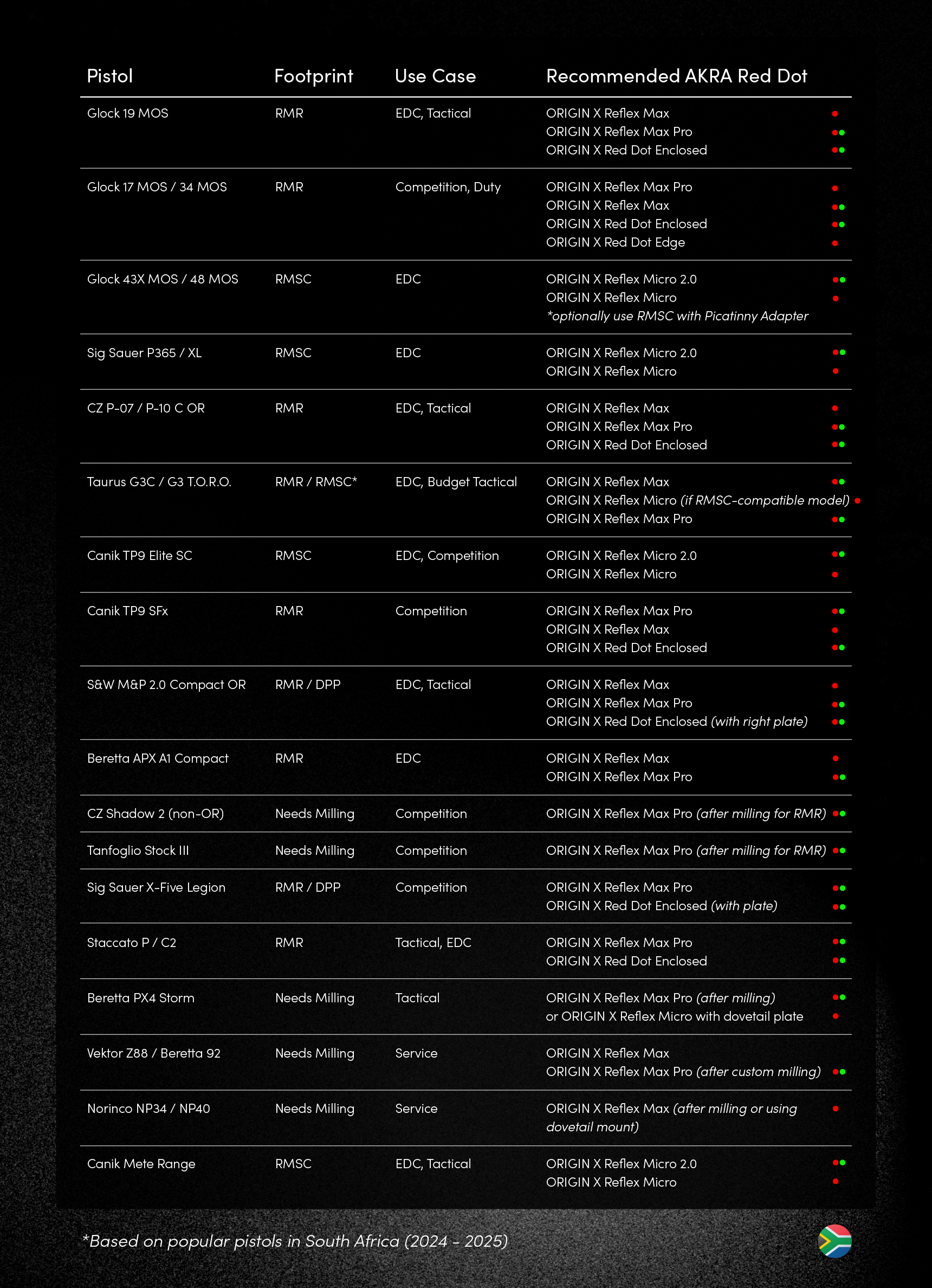 Not sure which red dot fits your handgun? We've got you. Use our compatibility guide below to find out which AKRA optic works with your setup — and whether your pistol is optic-ready or needs milling.