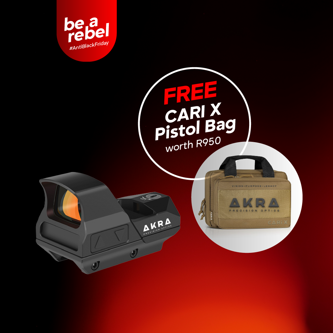 Compact, durable, and ready for action — plus a FREE CARI X Pistol Bag (worth R950) to carry your sidearm and gear, the AKRA way.